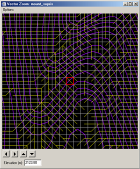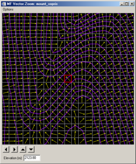 Note that we are speaking in terms of flows and mass balance even though our objective is to compute contributing areas on divergent surfaces as accurately as possible. The new Mass Flux algorithms are available in RiverTools via the Extract → Mass Flux Grid menu. In order to handle peaks and linear ridges as accurately as possible, grids based on quarter-pixels are created and saved (with QP for quarter-pixel in their name, along with their own RTI files) as an intermediate step. These have twice as many columns and rows as the original DEM, but are then integrated to create flow angle and area grids that have the same dimensions as the DEM. Continuous angle grids from the D-Infinity and Mass Flux methods look quite similar, but there can be significant differences between the area grids computed by the two methods as seen in the figure at the top of this page. Both the D-Infinity and Mass Flux algorithms use a D8 flow grid to resolve ambiguous flow situations in flats and pits. You can experiment with these different algorithms by using DEMs in the Test_Surfaces folder in the data folder within the main RiverTools_4.0 application folder. While they can give significantly different results on a divergent surface, they all give similar values for the contributing areas of larger, channelized watersheds. The Carbondale story on our Stories Page describes the role that the mass flux method played in protecting the water supply for the town of Carbondale, Colorado. More information on the D8 and D-Infinity algorithms can be found here. Here are two images that compare the interactive Vector Zoom tools for both the D8 and Rivix Mass Flux methods.