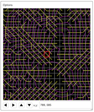 The accuracy of this contributing area does not depend on whether rainrate is actually uniform or not, it comes from recognizing that this problem can be reformulated as an equivalent fluid dynamics problem that must obey conservation of mass. In this case, the total contributing area (TCA) is equivalent to a volumetric discharge of water, Q, divided by a constant rainrate, R, i.e. A = (Q/R). As with the D-Infinity method, flow from a given pixel (grid cell) will typically be partitioned between two neighbor pixels, except in the case of pixels that are single-pixel peaks or that lie on drainage divides. However, with the mass flux method, flow will only be to nearest neighbors, as opposed to one nearest and one diagonal neighbor as is the case with the D-infinity method. This is consistent with the Divergence Theorem, which is a foundational concept used in computational fluid dynamics. Any multiple-flow direction algorithm that sends flow to more than two downhill neighbors (except on peaks and ridges) or to diagonal neighbors is provably incorrect and subject to a problem called overdispersion. Note that we are speaking in terms of flows and mass balance even though our objective is to compute contributing areas on divergent surfaces as accurately as possible. The new Mass Flux algorithms are available in RiverTools via the Extract → Mass Flux Grids dialog. In order to handle peaks and linear ridges as accurately as possible, grids based on quarter-pixels are created and saved (with QP for quarter-pixel in their name, along with their own RTI files) as an intermediate step. These have twice as many columns and rows as the original DEM, but are then integrated to create flow angle and area grids that have the same dimensions as the DEM. Continuous angle grids from the D-Infinity and Mass Flux methods look quite similar, but there can be significant differences between the area grids computed by the two methods as seen in the figure at the top of this page. Both the D-Infinity and Mass Flux algorithms use a D8 flow grid to resolve ambiguous flow situations in flats and pits. While the D8, D-Infinity, and Mass Flux methods all give significantly different results on a divergent surface, as occurs near peaks and ridgelines, then all give similar values for the contributing areas at the outlets of larger, channelized watersheds. The Carbondale story on our Stories Page describes how our mass flux method was instrumental in protecting the water supply for the town of Carbondale, Colorado. More information on the D8 and D-Infinity algorithms can be found here. Here are two images that compare the interactive Vector Zoom tools for both the D8 and Rivix Mass Flux methods.